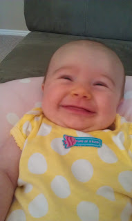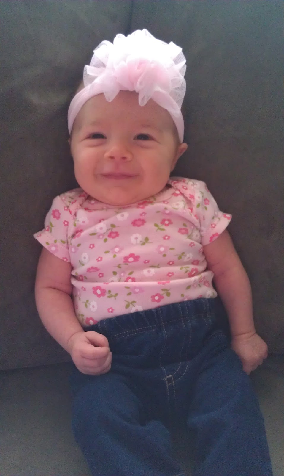 Colic is a BITCH! Seriously! I don't know how many tears I cried and how many days I wished I was at work rather than stuck in the mommy rabbit hole. But with lots or support from my husband and encouragement from my mom and sisters and a complete change in my diet Bug's tummy is finally settled! She is the happiest, cutest baby EVER! (I am not bias... ok maybe a little) She has been smiling since birth! Here are a few pictures to prove it!